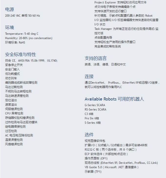 爱普生G系列机器人拥有高速度、高精度和低震动特性。可满足任意应用需求,其中包括支持多任务、洁净车间、防静电或冲洗环境中使用的机型。
