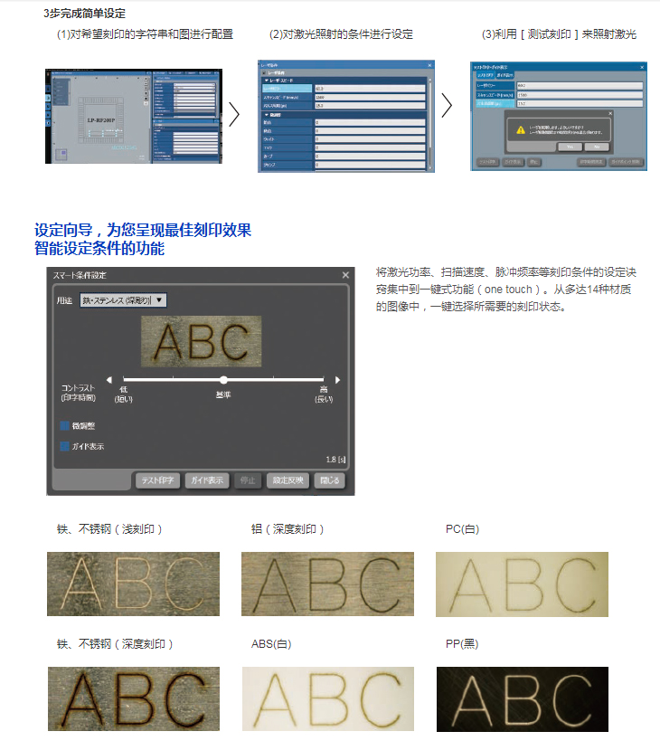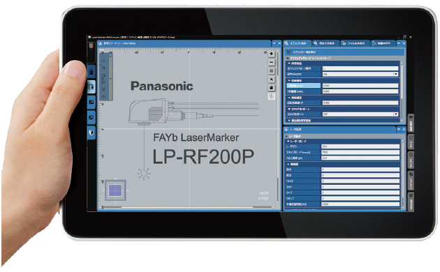 沿用CO2激光打标机 LP-GS中广受好评的新软件「Laser Marker NAVI smart」。利用计算机和平板电脑,即可随心所欲地设定字符串、Logo、二维码等。另外,可根据使用环境来自定义画面布局, 还能根据使用者的目的来更改“设定者”、“操作者”等的显示。