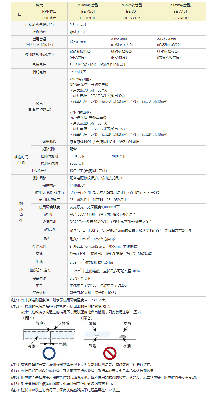 对应细径软管的气泡检测传感器