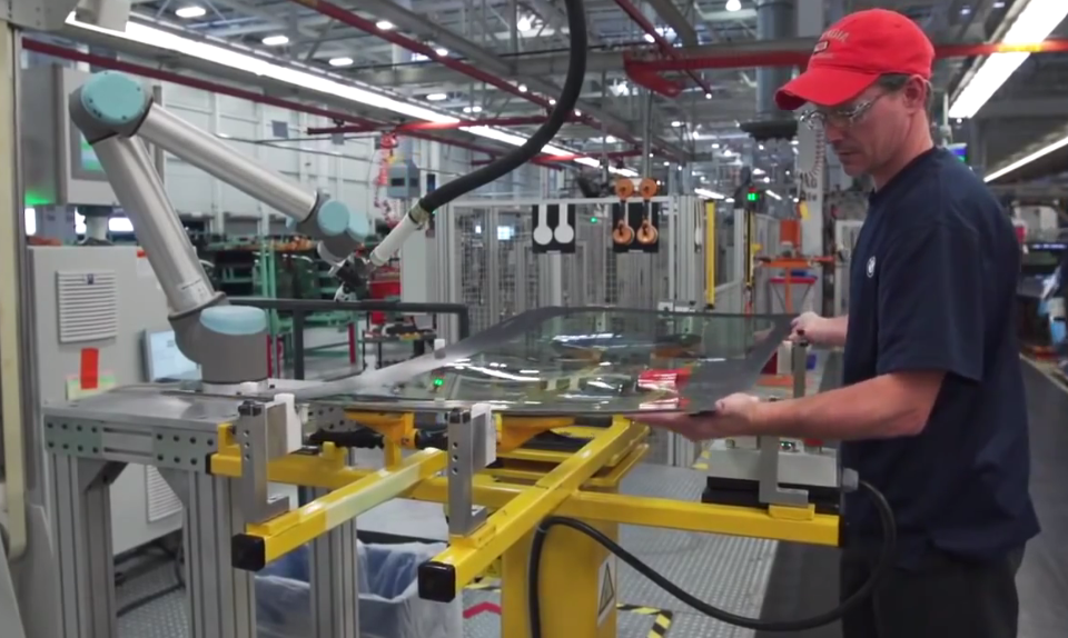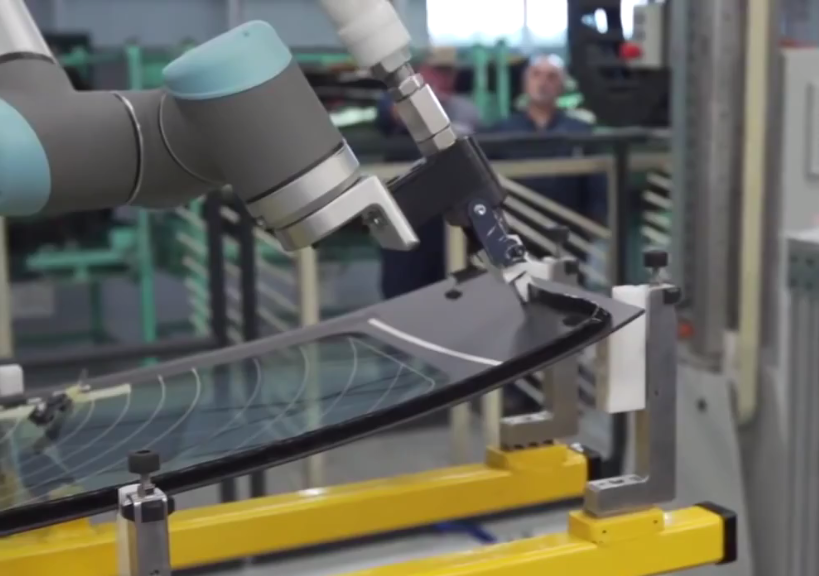 车辆安装挡风玻璃时,需要在总装车间完成前、后挡风玻璃的涂胶及装配工序。而装配品质由涂胶质量及安装质量共同决定,涂胶及装配质量不仅影响整车的降噪、防漏水品质,还直接影响用户对整车的感觉。优傲机器人在涂胶质量和效率上有出色的表现,机器人涂胶,从事的工作量大,做工精细,质量好,工作效率大幅提高。省去大量人力,降低人工成本,所以越来越多的总装车间采用UR机器人完成涂胶及装配工作。